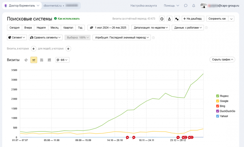 Наша компания CapsGROUP продвигая сайт клиента в поисковых системах Яндекс, кратно увеличила посещаемость сайта dbormental.ru, что привело к значительному росту количества заявок.